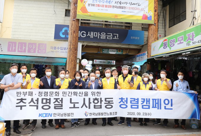 한국남동발전은 23일 진주 중앙시장에서 김봉철 상임감사위원을 비롯한 노조 간부, KOEN 나눔봉사단과 청렴동아리 회원 10여명이 참석한 가운데, 노사합동 추석맞이 전통시장 장보기 행사와 함께 지역사회에 청렴문화 조성을 위한 청렴캠페인을 시행했다.