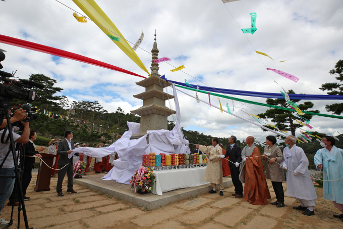 군은 25일 동의보감촌 한의학박물관 앞 공터에서 산청 범학리 삼층석탑 복제·상륜부 복원 완료를 기념하는 제막식을 가졌다.