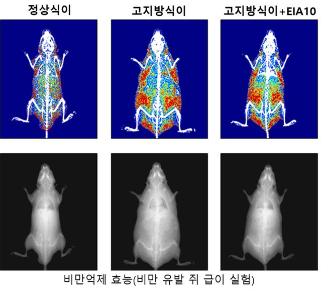 논문 내용에 의하면 EIA10을 분리 동정하고 인공적으로 합성을 한 뒤 비만이 유발된 쥐에 급이하고 5주 후의 변화를 분석한 결과, 체중증가 억제, 혈액지표 성분의 정상화, 지방간의 억제 등의 효과가 탁월하게 나타났다.