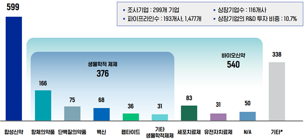 합성신약 599개(40.6%), 바이오신약 540개(36.6%), 기타 338개(22.9%) 순