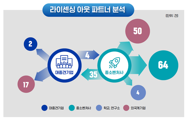 기업규모별로는 중소·벤처사의 라이선스 이전 건수가 250건으로, 대·중견기업(81건) 보다 3배 이상 많았다. 라이선스 이전의 파트너를 분석한 결과 대·중견기업은 외자 기업에 대한 라이선스 아웃(17건) 비중이 높았다. 중소·벤처사는 ▲국내 중소벤처(64건) ▲외자기업(50건) ▲대·중견기업(35건) 등 고른 분포를 보여 바이오벤처와 제약기업, 외자기업으로 연결되는 선순환 형태의 개방형 혁신이 활기를 띄는 것으로 풀이된다.