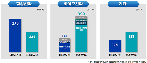 다만 대‧중견기업은 합성신약, 바이오신약, 기타 신약 파이프라인 중에서 합성신약(375개, 58.5%) 비중이 제일 높았다. 반면 중소‧벤처사는 바이오신약(399개, 47.7%)을 가장 많이 보유해 대조를 이뤘다.