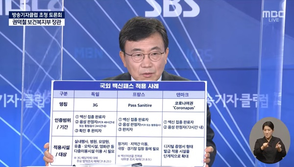 권덕철 보건복지부 장관은 지난 28일 오전 서울 양천구 대한민국예술인센터에서 열린 한국방송기자클럽 초청 토론회에서 “현재의 확진자 중심의 여러 가지 방역수칙 혹은 사회적 거리두기를 하기에는 국민들께서 특히 소상공 자영업자분들께서 많이 힘들다. 그래서 전문가와 언론, 국민과 함께 앞으로의 거리두기와 방역조치를 어떻게 가져갈지, 단계적으로 일상 회복 방법을 찾으려고 한다”며 “영국이나 독일 등 외국에서도 접종 완료자나 완치자, 음성확진자에 대해 방역수칙을 완화하는 ‘백신 패스’를 통해 일상회복을 찾아가고 있다”고 밝혔다.