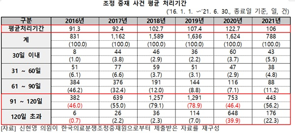 신 의원이 중재원으로부터 제출받은 자료에 따르면, 지난해 평균 처리기간은 122.7일로 2016년 91.3일에 비해 34.4% 증가한 것으로 확인됐다. 같은 기간 처리 사건은 831건에서 1,624건으로 2배 가량 증가했다.