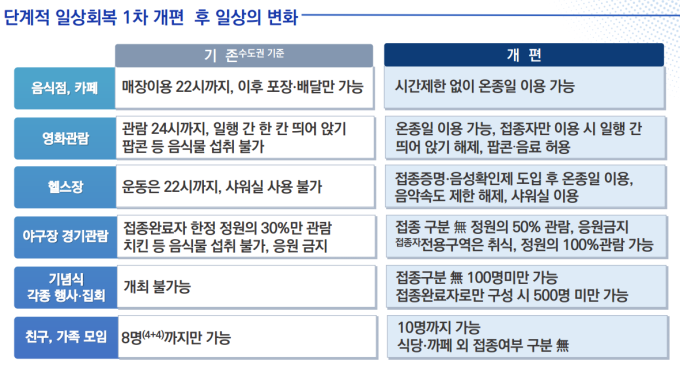 1차 개편에선 생업시설 운영제한 완화, 2차 개편에선 대규모 행사허용, 3차 개편에서는 사적 모임 제한을 해제할 계획이다. 생업시설의 애로를 고려해 1차 개편부터 모든 시설의 시간 제한을 해제한다. 다만, 유흥시설·콜라텍·무도장 등에 대해서는 24시까지 완화하기로 했다.