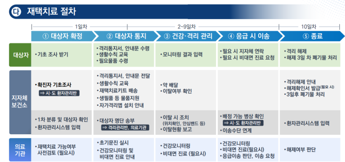 무증상·경증 확진자를 대상으로 하는 재택치료를 확대할 계획이다. 다만, 70세 이상·의식장애·호흡곤란·조절되지않는 발열·당뇨·정신질환·투석 등 입원 필요 환자·감염 취약 주거 환경·의사소통 어려운 경우는 제외한다. 지방자치단체에 재택치료관리팀을 신설해 지역 의료기관·소방서 등과 유기적 연계체계를 마련하기로 했다. 보건소 시·도 환자관리반이 대상자를 확정하게 된다. 중등증 이상의 경우에는 이전과 같이 의료기관에서 치료를 받게 되고, 확진자 추이 및 재택치료 안정화 등을 고려해 생활치료센터는 단계적 감축에 나설 계획이다.
