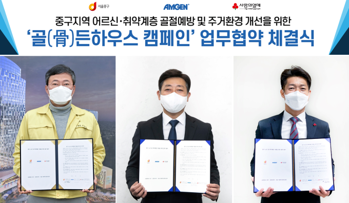 암젠코리아는 서울 중구청, 서울사회복지공동모금회와 중구 지역 내 어르신 및 취약계층의 골절예방과 주거환경 개선을 위한 ‘골(骨)든하우스 캠페인’ 업무협약을 체결했다고 9일 밝혔다.