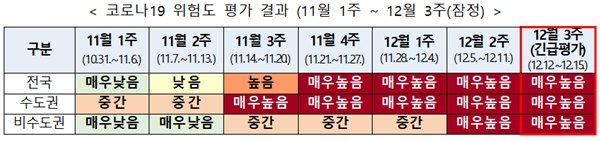 일평균 확진자수는 6448명으로 11월 1주(2133명)의 약 3배에 달하고, 12월 3주 들어 7000명대를 초과했다. 수도권의 하루 평균 확진자 수는 4700명대로 감당 가능한 확진자 수인 3600명대를 크게 상회하고 있다.