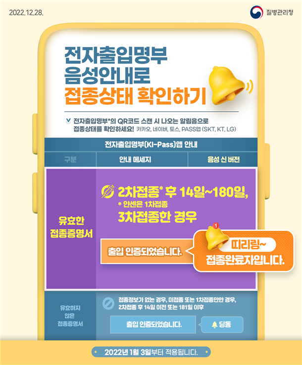 1월3일부터 QR코드 스캔 시 나오는 음성 안내에 따라 이용자의 접종상태를 확인할 수 있다. 기본 접종을 완료하고 14~180일 사이 이거나 3차 접종을 완료한 경우에는 ‘접종완료자입니다’라는 음성이 들리게 되고, 미접종자나 방역패스 유효기간이 지난 경우에는 ‘딩동’이라는 경고음이 울리게 된다.