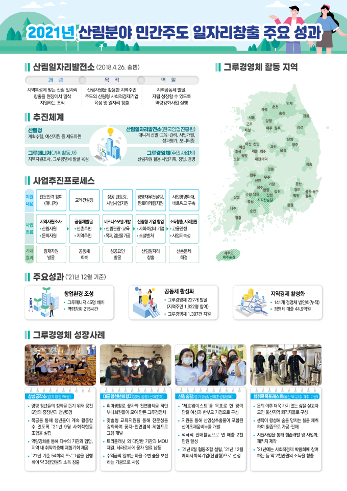 산림청은 사회적 경제 일자리 확대를 위해 산림자원을 활용한 주민공동체 중심의 일자리 창출을 지원하는 산림일자리발전소를 2018년 신설한 이후 산림분야의 새로운 일자리를 만들어 가고 있다.