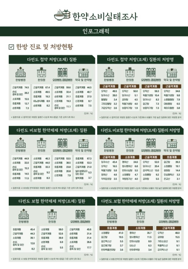 한의원, 요양·(종합)병원, 약국‧한약방의 첩약 다빈도 처방(조제) 질환과 그에 대한 처방명도 각각 근골격계통과 오적산이 가장 많았다.