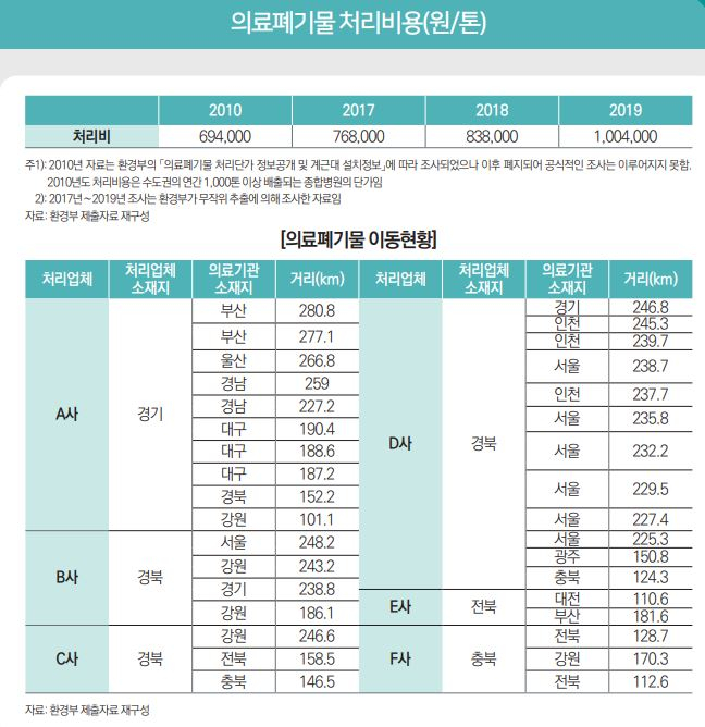 지난 2019년 국회 입법조사처에서 발표한 자료에 따르면 2010년 1톤당 69만4000원이던 의료폐기물 처리비용은 △2017년 76만8000원 △2018년 83만8000원 △ 2019년 100만4000원으로 증가했다.