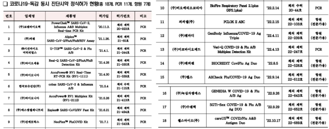 17일 식품의약품안전처에서 공개한 코로나19-독감 동시 진단시약 정식허가 현황에 따르면 유전자증폭검사 11개, 전문가용 신속항원검사 7개로, 총 18개 제품이 있다.