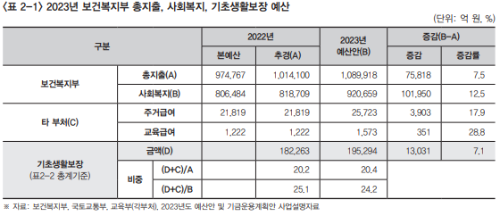 기초생활보장 예산은 지난해 추경 대비 7.1% 증가했다. 주거급여와 교육급여는 각각 17.9%, 28.8% 증가했다. 코로나19 국면에서 저소득층 생활을 지원하기 위한 저소득층 한시생활지원은 전액 순감됐다. 2020년 1조614억원이 편성됐지만 2021년, 2022년 본예산에서 전액 삭감 후 추경으로 각각 2960억, 9902억원이 편성된 바 있다. 2023년에는 예산이 편성되지 않았다.
