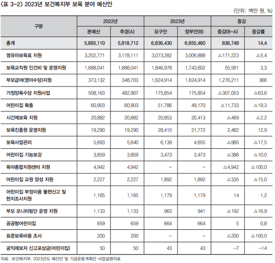 보육 분야에서는 국공립 어린이집 확충과 어린이집 기능보강 사업 예산이 줄어든 점이 도마에 올랐다. 보육분야 예산은 6조6555억원이다. 지난해 추경 대비 14.4% 증가했다. 이 가운데 부모급여 지원 예산은 1조6249억이다. 국공립 어린이집 확충 예산은 2022년 609억원에서 2023년 492억원으로 19.3%가 줄었다. 어린이집 시설 보수와 장비 예산은 38억원에서 35억원으로 약 10% 삭감됐다.