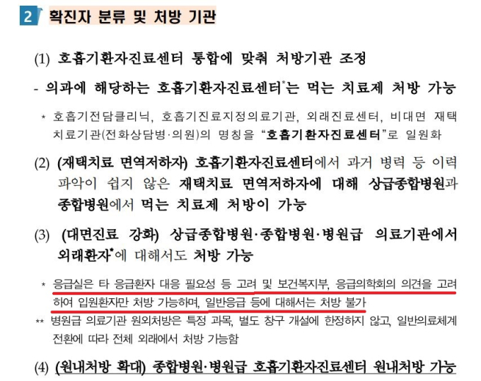 그동안 코로나19 확진자여도 경증 환자라면, 응급실에서 먹는치료제를 처방 받을 수 없었다. 질병관리청 중앙방역대책본부(방대본)의 ‘코로나19 치료제 사용 안내서(제9판)’에 따르면 응급실은 입원환자만 먹는치료제 처방이 가능하며, 일반 응급 등에 대해서는 처방 불가하다고 명시돼 있다.