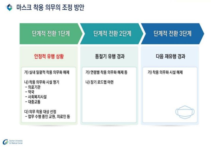 거리두기 조정처럼 실내 마스크 착용 의무 해제도 단계적 접근이 필요하다고 봤다. 1차적으로 의료기관·약국·사회복지시설·대중교통 등을 제외 권고로 전환한 뒤 동절기 유행이 경과하는 경우 연령별(영유아) 착용을 권고로 전환하는 단계별 조정 방식이다.