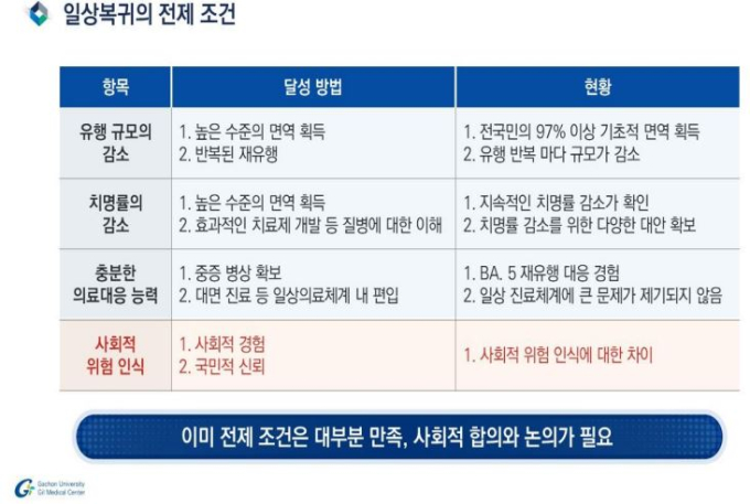 일상 회복과 관련해서는 유행 규모 및 치명률 감소, 일상 의료 체계 작동 등 대부분의 전제 조건은 만족하고 있지만, 사회적 위험 인식에 대한 차이로 합의와 논의가 필요하다고 강조했다.