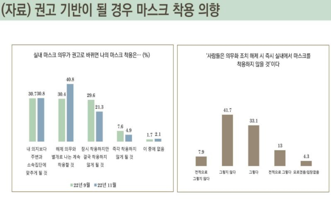 설문조사에서도 실내 마스크 착용 의무 해제에 찬성하는 사람이 반대하는 사람보다 더 많은 것으로 나타났다. 지난 9월 서울대 유 교수 연구팀이 조사기관 케이스탯리서치와 공동 만 18세 이상 전국 거주 성인 남녀 1000명을 대상으로 실시한 조사 결과, ‘코로나19 인식조사’ 결과 응답자 55%가 실내마스크를 해제할 수 있다고 답했다.