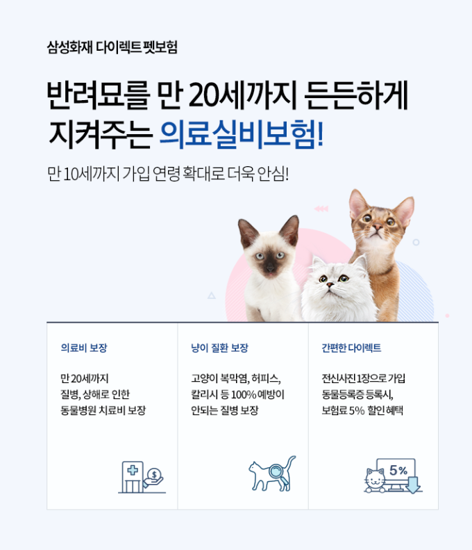 이 상품은 반려묘의 상해와 질병에 대한 입·통원의료비 및 수술비, 비뇨기질환 보장, 사망위로금 등을 종합적으로 보장하는 상품으로 3년 또는 5년 주기의 갱신을 통해 최대 20세까지 보장받을 수 있다. 가입가능연령은 생후 61일부터 만 10세까지로 가입 가능연령이 기존 만 8세보다 늘어났다.