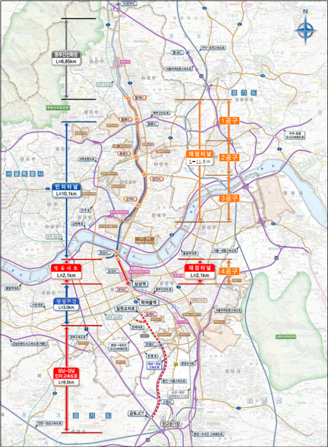민자사업 구간은 월릉교에서 영동대교 남단까지 대심도 4차로, 연장 10.1㎞ 지하도로로 건설된다. 올 하반기 착공해 2028년 개통될 예정이다.