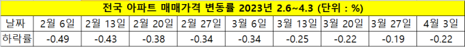 6일 한국부동산원 ‘4월 1주 주간 아파트가격 동향’을 보면 3일 현재 전국 주간 아파트 매매가격 변동률은 -0.22%로 지난주(-0.19%)보다 커졌다.