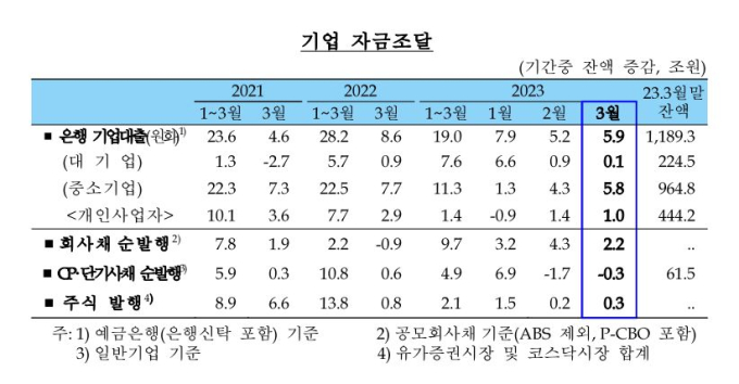 이처럼 가계대출은 꾸준히 감소세를 기록했지만 기업대출은 큰 폭으로 늘어났다는 것이 한국은행의 설명이다. 지난달 기업대출은 전월 말 대비 5조9000억원 증가한 1189조3000억원으로 집계돼 3개월 연속 증가했다. 전월(5조2000억원 증가) 대비 증가폭이 확대됐다. 이는 통계 작성 이후 3월 증감액 기준 세 번째로 큰 수치다.