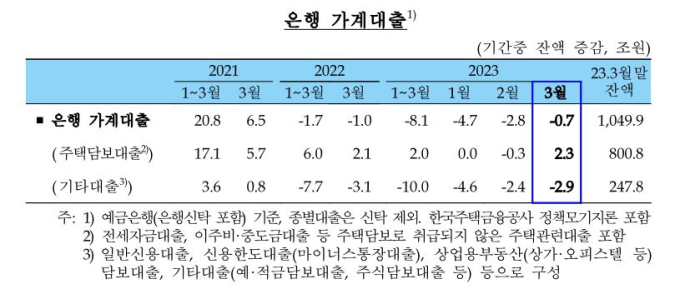 가계대출 세부사항을 보면 신용대출을 포함한 기타대출(잔액 247조8000억원)이 2조9000억원 축소됐다. 2021년 12월(-2조2000억원) 이후 16개월 연속 감소다. 반대로 주택담보대출은 2조3000억원 증가했다. 일반 주택담보대출이 4조6000억원가량 증가한 영향이다. 전세자금 대출은 2월에 이어 3월에도 2조원 이상(2조3000억원) 감소했다. 전셋값은 떨어진 데다 월세 전환도 늘어난 영향으로 보인다.
