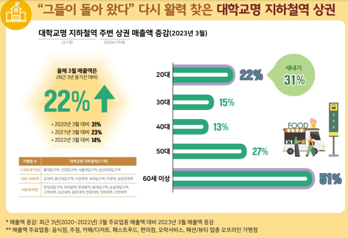 대학교 주변 지하철역 상권의 지난달 매출액이 지난 3년 3월 평균 매출액 대비 22% 증가했다. 전체 매출액의 45%를 차지하는 20대 매출액도 22% 증가한 것으로 나타났다.