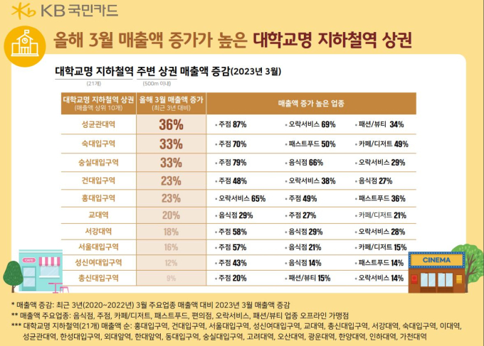 KB국민카드는 20일 코로나19 종결 이후 처음 맞는 새 학기를 맞아 대학교명으로 된 지하철역 주변 상권의 최근 4년간 3월 매출액을 비교·분석한 결과를 발표했다.