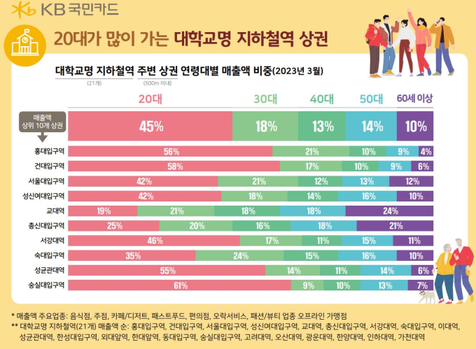 상권 별 주 이용 연령대를 보면, 60대 이상의 매출액 비중이 24%로 가장 높은 교대역을 제외하고, 20대의 매출 비중이 가장 높았고 숭실대입구역 61%, 건대입구역 58%, 홍대입구역 56%, 성균관대역 55%로 나타났다. 30대 비중은 숙대입구역 24%, 서울대입구역, 교대역, 홍대입구역 각 21% 순으로 높았고, 4050은 교대역 36%, 총신대입구역 34%, 숙대입구역 31%, 성신여대입구역 30%로 나타났다.