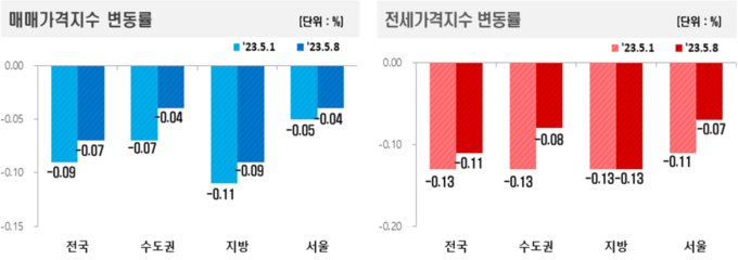 하락폭(-0.07%→-0.09%)은 줄었다. 수도권(-0.07%→-0.04%)과 서울(-0.05%→-0.04%), 지방(-0.11%→-0.09%) 하락폭 역시 축소됐다.