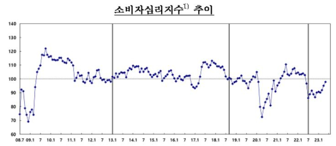 소비자들의 경제인식과 심리를 보여주는 소비자심리지수(CCSI)는 1년만에 최고치를 기록했다.