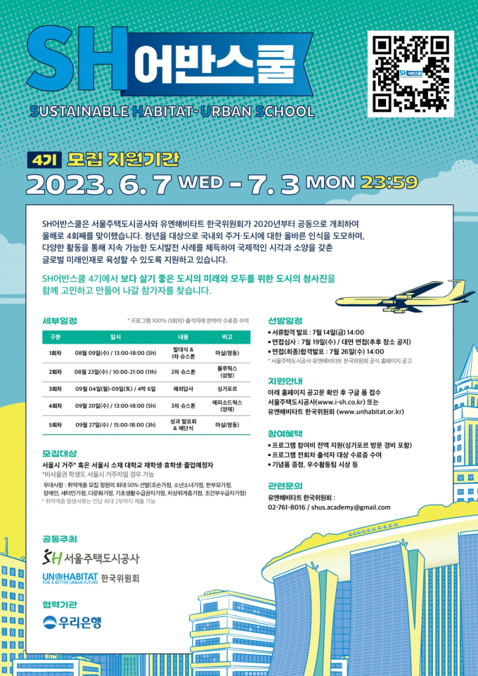 SH공사와 유엔해비타트 한국위원회는 오늘(7일)부터 내달 3일까지 대학생 사회공헌활동 프로그램 SH어반스쿨 4기 참가자를 모집한다.