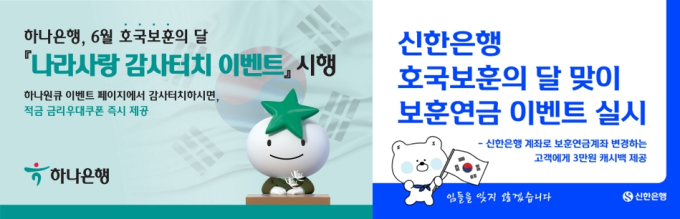 신한은행과 하나은행은 금융소비자들을 대상으로 이벤트를 진행한다. 먼저 신한은행은 보훈연금 입금계좌를 신한은행으로 변경하는 소비자에게 캐시백을 제공하는 ‘보훈연금 입금계좌 변경 이벤트’를 진행한다. 6월 한 달간 보훈연금 입금계좌를 신한은행 계좌로 변경해 7월 말까지 보훈연금이 입금되면 3만원 캐시백을 지급한다.