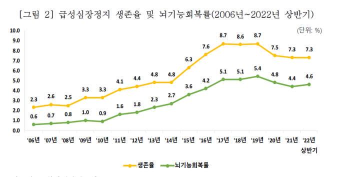 급성심장정지 환자 중 생존 상태로 퇴원한 환자(생존율)는 7.3%였다. 이 중 일상생활이 가능할 정도로 뇌기능을 회복해 퇴원한 환자(뇌기능회복률)는 4.6%였다.