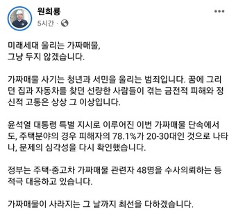 원 장관은 28일 페이스북을 통해 “윤석열 대통령 특별 지시로 이뤄진 이번 가짜매물(사기) 단속에서 주택분야 피해자의 78.1%가 20~30대”였다며 “문제의 심각성을 다시 확인했다”고 밝혔다.