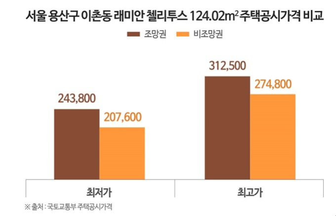 서울에서 대표적인 아파트 조망은 ‘한강 조망’을 꼽는다. 한강변과 접한 용산구에서 한강조망 여부에 따라 가격차이가 발생하는 단지로 이촌동 ‘래미안 첼리투스’가 있다. 이 아파트 전용면적 124.02㎡는 101동은 1호라인에 분포하며 뛰어난 한강조망권을 자랑한다. 이 면적의 주택공시가격은 저층은 24억3,800만원이며 고층은 31억2,500만원 수준이다.