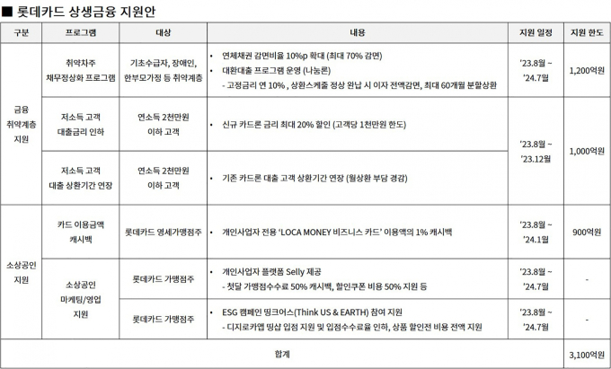 롯데카드의 상생금융 지원안은 오는 8월부터 시행된다. 금융 취약계층에 대한 취약차주 채무정상화 프로그램은 시행일로부터 1년간, 저소득 고객 대출금리 인하 및 대출 상환기간 연장은 연말까지 시행되며, 소상공인에 대한 카드 이용금액 캐시백은 시행일로부터 6개월간, 마케팅/영업 지원은 1년간 시행될 예정이다.