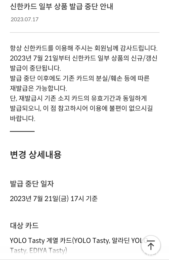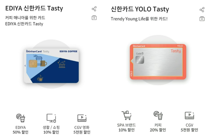 신한카드는 17일 ‘신한카드 욜로 테이스티’ 계열 카드(YOLO Tasty, 알라딘 YOLO Tasty, EDIYA Tasty) 갱신 및 발급을 오는 21일 오후 5시부터 중단한다고 홈페이지에 공지했다. 발급 중단 이후에도 기존 카드 분실, 훼손 등에 따른 재발급은 가능하다. 단, 재발급 시 기존 소지 카드 유효기간 연장은 기존과 동일하다.