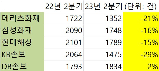 손보사들에 접수된 총 민원 건수는 1년 전인 2022년 2분기 1만3073건, 3분기 1만2300건, 4분기 1만2377건, 2023년 1분기 1만2268건을 기록하다가 이번 분기 처음으로 1만2000건 밑으로 떨어졌다.