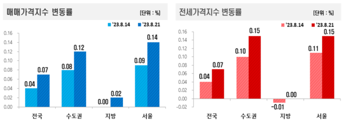 지역별로 보면 수도권(0.08%→0.12%)과 서울(0.09%→0.14%)은 상승폭이 커졌다. 지방(0.00%→0.02%)은 상승 전환됐다.