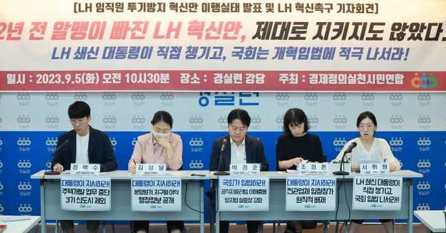 경실련은 “LH 100억대 땅 투기 의혹 이후 2년간 LH 혁신은 아무런 성과도 없었음이 확인됐다. 알맹이 없는 혁신안과 능력도, 의지도 없는 LH와 국토부에 맡긴 당연한 결과”라고 비판했다.