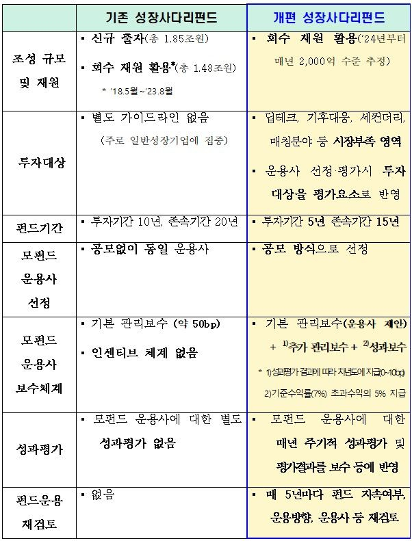 펀드 재원은 기존 성장사다리펀드 투자 금액(1조8500억원)에서 회수되는 원금을 새로운 펀드에 출자해 마련하기로 했다. 금융위는 이를 통해 앞으로 5년 간 매년 2000억원 상당의 자금을 확보할 수 있을 것으로 추산한다.