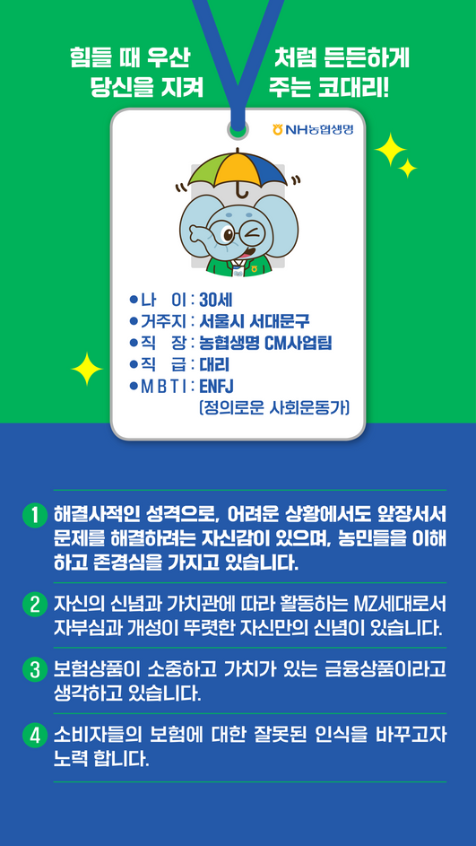 농협생명은 내달 5일까지 온라인보험 사이트에서 ‘코대리 별명 맞추기 퀴즈 이벤트’를 실시한다. 윤해진 농협생명 대표이사는 “언제나 고객을 위해 더 나은 서비스를 제공하겠다”고 말했다.