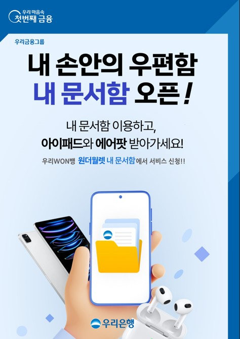 우리은행은 ‘내 문서함’ 서비스 출시를 기념해 이달 20일까지 이벤트를 실시한다. 우리WON뱅킹에서 ‘내 문서함’ 서비스를 신청하고 마케팅 활용 동의를 한 고객 중 추첨을 통해 아이패드 PRO 11과 에어팟 PRO 2세대를 증정하는 경품 이벤트를 진행한다. 추가로 추첨을 통해 1,000명에게는 스타벅스 쿠폰도 제공한다.