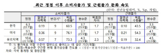한은은 주요국의 물가상승률은 상당 기간 목표 수준을 상회하는 가운데, 물가 상승 둔화 동인이 차별화 양상을 보여온 만큼 물가 목표 수렴 시점도 국가별로 다소 차이를 보일 것으로 예상했다.