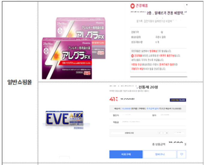 적발된 의약품의 종류는 종합감기약 등 해열진통제가 255건, 비염약 등 항히스타민제 29건 순이었다. 모두 국내에서 허가된 바 없으나 해외직구와 구매대행 등의 방식으로 온라인에서 유통되는 해외 의약품이다. 이들 제품은 주의사항 등 소비자의 안전을 지켜줄 최소한의 정보도 제공하지 않았다.