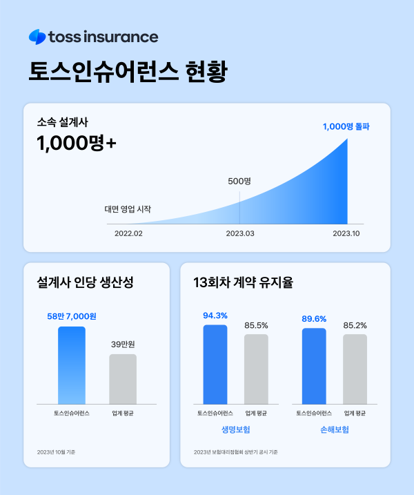 비바리퍼블리카(토스)의 법인보험대리점(GA) 자회사 토스인슈어런스가 10월 말 기준 소속 설계사 1000명을 돌파했다고 23일 밝혔다.