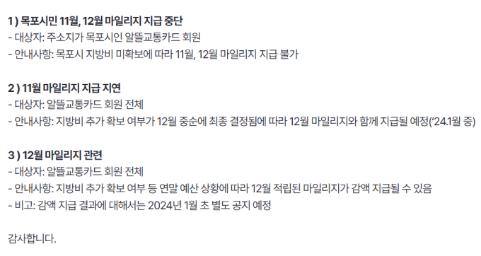 국토부 대도시권광역교통위원회는 주소지가 목포시인 알뜰교통카드 회원의 경우, 11월과 12월 마일리지 지급이 중단된다고 지난 27일 공지했다. 또 알뜰교통카드 회원 전체를 대상으로는 11월 마일리지는 지급이 지연되고, 12월 마일리지는 감액 지급될 수 있다고 알렸다.